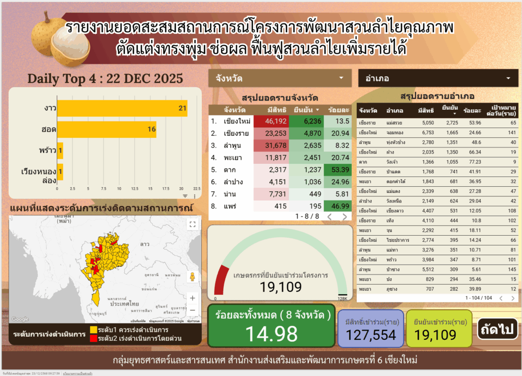 สสก.6 จ.เชียงใหม่ ติดตามรองอธิบดีกรมส่งเสริมการเกษตร ลงพื้นที่ ”หางดง” ชี้แจงโครงการพัฒนาสวนลำไยคุณภาพตัดแต่งทรงพุ่ม/ช่อผล ฟื้นฟูสวนลำไย