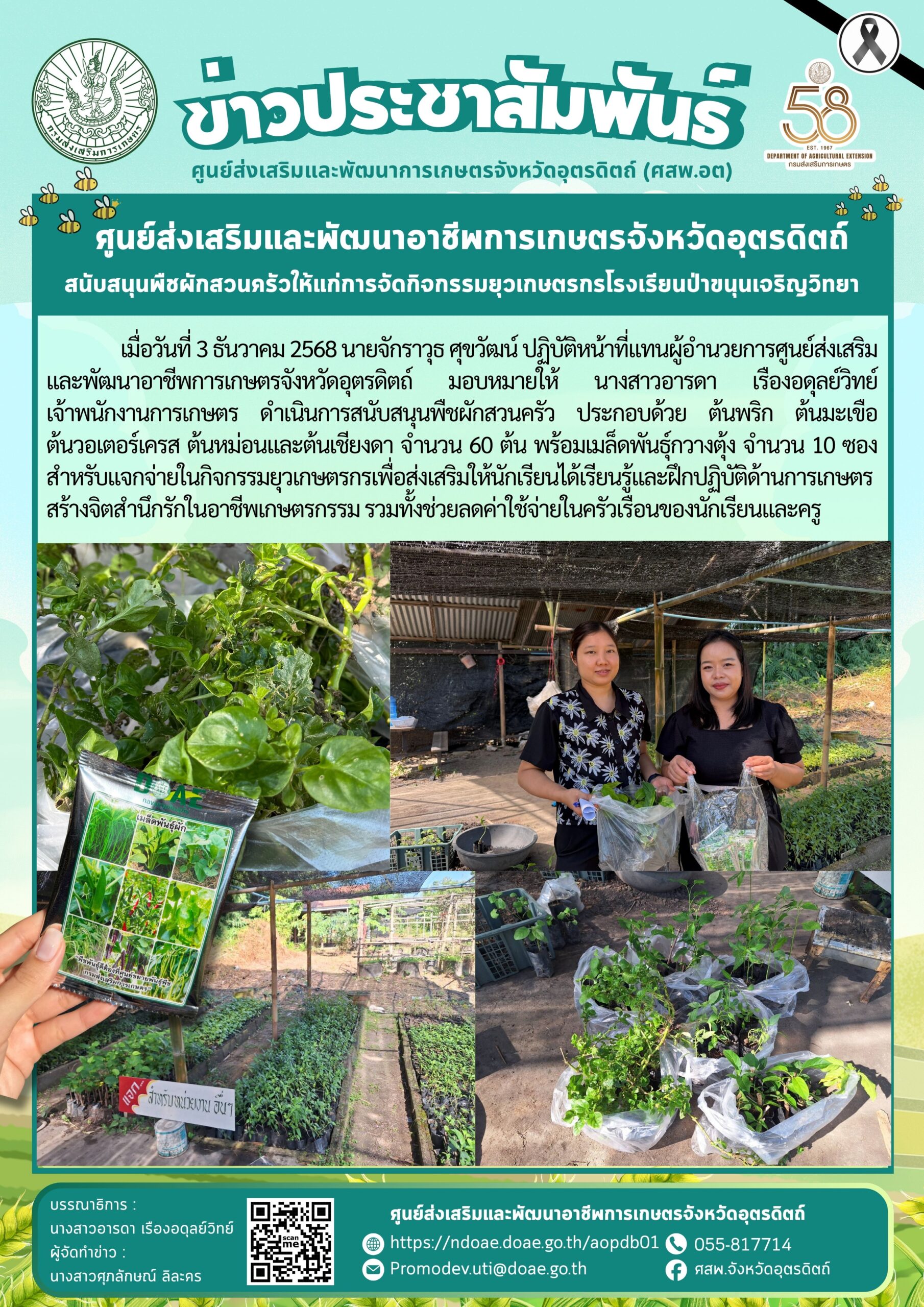 ศสพ.อุตรดิตถ์ สนับสนุนพืชผักสวนครัวให้กิจกรรมยุวเกษตรกรโรงเรียนป่าขนุนเจริญวิทยา