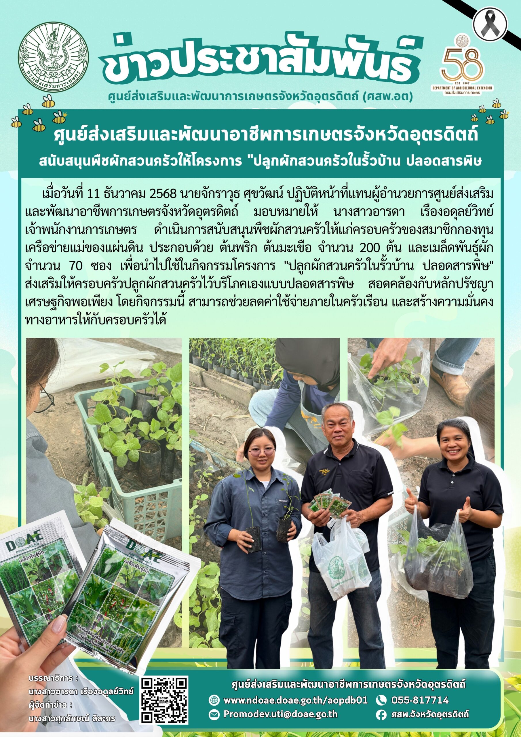 ศสพ.อุตรดิตถ์ สนับสนุนพืชผักสวนครัวให้โครงการ “ปลูกผักสวนครัวในรั้วบ้าน ปลอดสารพิษ”