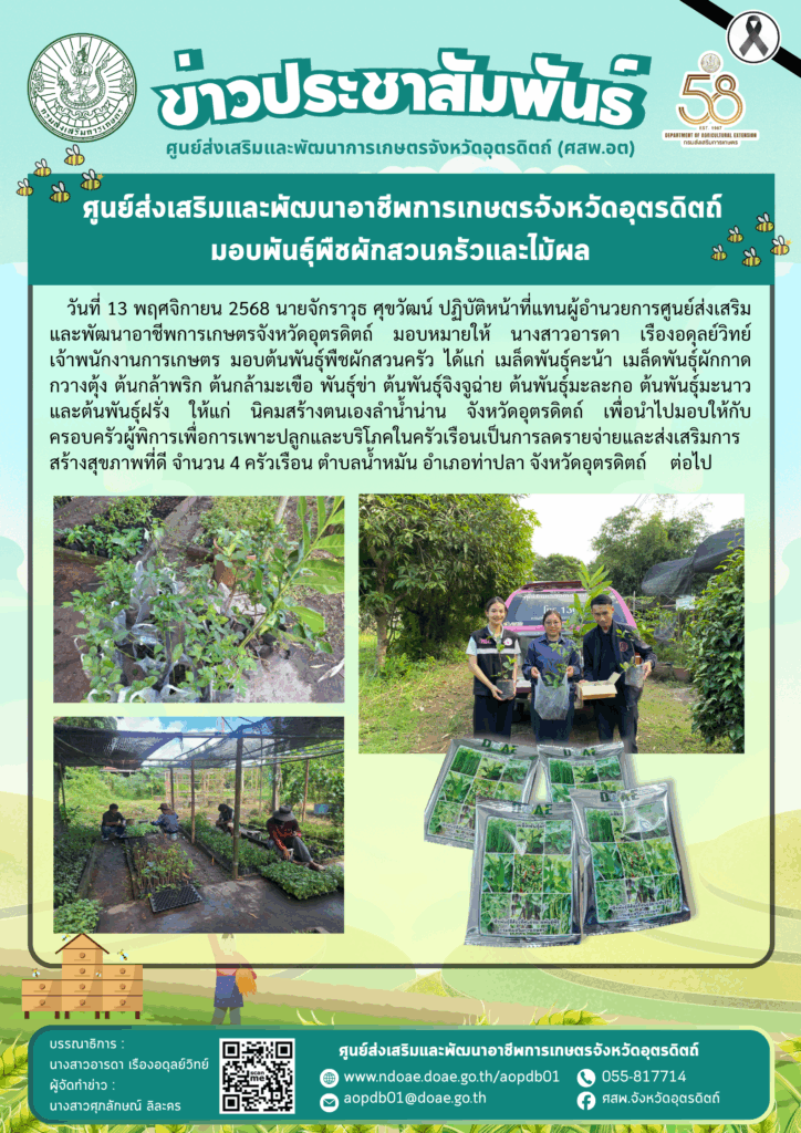 เมื่อวันที่ 13 พฤศจิกายน 2568 นายจักราวุธ ศุขวัฒน์ ปฏิบัติหน้าที่แทนผู้อำนวยการศูนย์ส่งเสริมและพัฒนาอาชีพการเกษตรจังหวัดอุตรดิตถ์ ได้มอบหมายให้นางสาวอารดา เรืองอดุลย์วิทย์ เจ้าพนักงานการเกษตร มอบต้นพันธุ์พืชผักสวนครัวและไม้ผลให้แก่นิคมสร้างตนเองลำน้ำน่าน จังหวัดอุตรดิตถ์