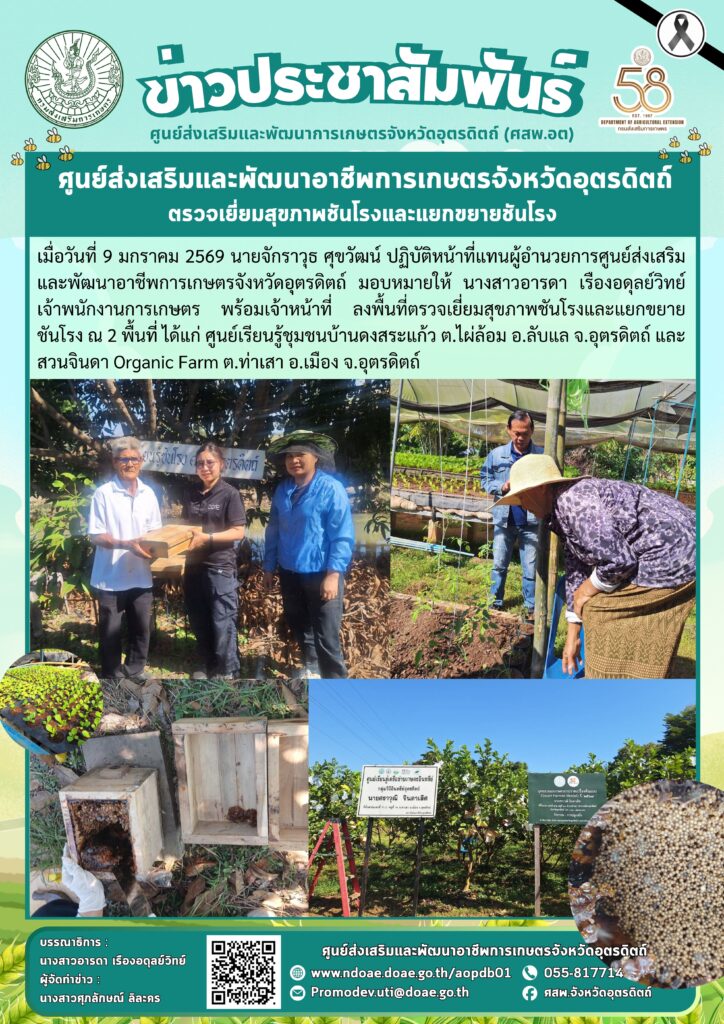 เมื่อวันที่ 9 มกราคม 2569 นายจักราวุธ ศุขวัฒน์ ปฏิบัติหน้าที่แทนผู้อำนวยการศูนย์ส่งเสริมและพัฒนาอาชีพการเกษตรจังหวัดอุตรดิตถ์ มอบหมายให้ นางสาวอารดา เรืองอดุลย์วิทย์ เจ้าพนักงานการเกษตร พร้อมเจ้าหน้าที่ ลงพื้นที่ตรวจเยี่ยมสุขภาพชันโรงและแยกขยายชันโรง ณ 2 พื้นที่ ได้แก่ ศูนย์เรียนรู้ชุมชนบ้านดงสระแก้ว ต.ไผ่ล้อม อ.ลับแล จ.อุตรดิตถ์ และสวนจินดา Organic Farm ต.ท่าเสา อ.เมือง จ.อุตรดิตถ์