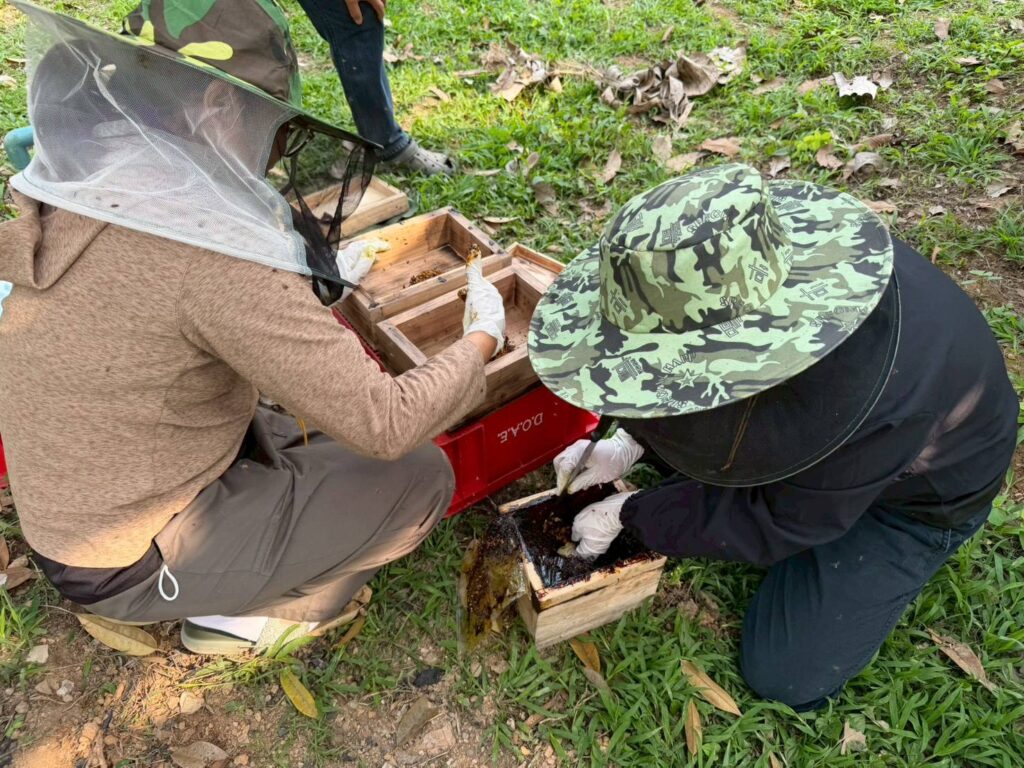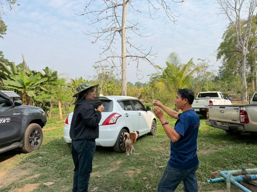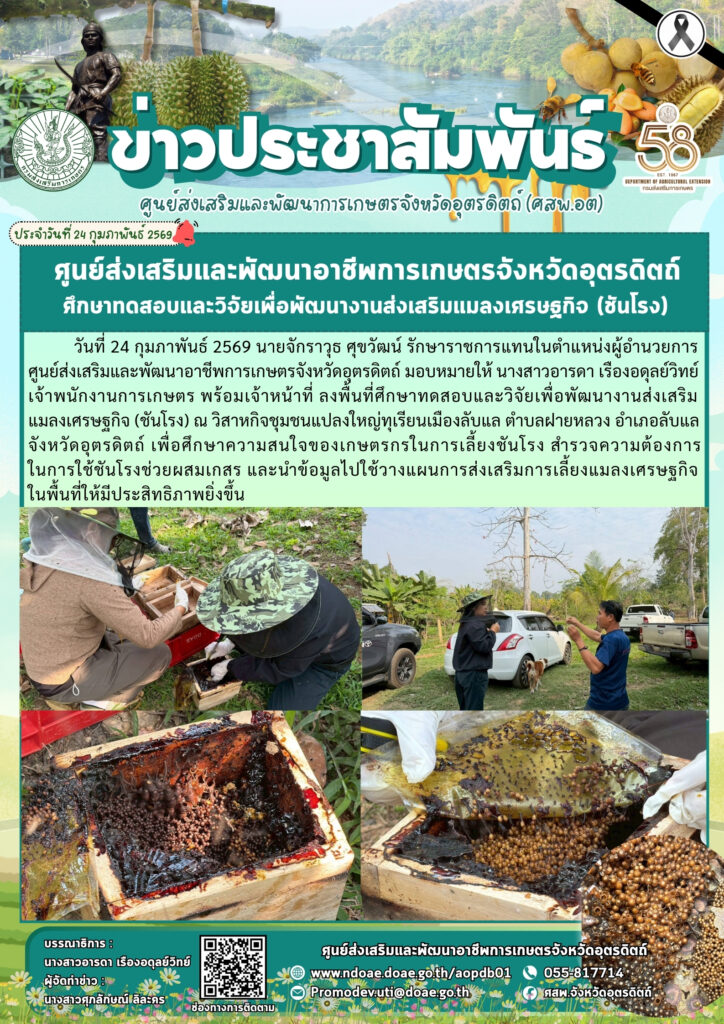 วันที่ 24 กุมภาพันธ์ 2569 นายจักราวุธ ศุขวัฒน์ รักษาราชการแทนในตำแหน่งผู้อำนวยการศูนย์ส่งเสริมและพัฒนาอาชีพการเกษตรจังหวัดอุตรดิตถ์ มอบหมายให้ นางสาวอารดา เรืองอดุลย์วิทย์ เจ้าพนักงานการเกษตร พร้อมเจ้าหน้าที่ ลงพื้นที่ศึกษาทดสอบและวิจัยเพื่อพัฒนางานส่งเสริมแมลงเศรษฐกิจ (ชันโรง) ณ วิสาหกิจชุมชนแปลงใหญ่ทุเรียนเมืองลับแล ตำบลฝายหลวง อำเภอลับแล จังหวัดอุตรดิตถ์ เพื่อศึกษาความสนใจของเกษตรกรในการเลี้ยงชันโรง สำรวจความต้องการในการใช้ชันโรงช่วยผสมเกสร และนำข้อมูลไปใช้วางแผนการส่งเสริมการเลี้ยงแมลงเศรษฐกิจในพื้นที่ให้มีประสิทธิภาพยิ่งขึ้น