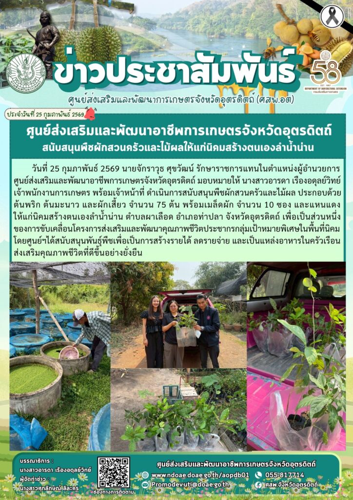 วันที่ 25 กุมภาพันธ์ 2569 นายจักราวุธ ศุขวัฒน์ รักษาราชการแทนในตำแหน่งผู้อำนวยการศูนย์ส่งเสริมและพัฒนาอาชีพการเกษตรจังหวัดอุตรดิตถ์ มอบหมายให้ นางสาวอารดา เรืองอดุลย์วิทย์ เจ้าพนักงานการเกษตร พร้อมเจ้าหน้าที่ ดำเนินการสนับสนุนพืชผักสวนครัวและไม้ผล ประกอบด้วย ต้นพริก ต้นมะนาว และผักเสี้ยว จำนวน 75 ต้น พร้อมเมล็ดผัก จำนวน 10 ซอง และแหนแดง ให้แก่นิคมสร้างตนเองลำน้ำน่าน ตำบลผาเลือด อำเภอท่าปลา จังหวัดอุตรดิตถ์ เพื่อเป็นส่วนหนึ่งของการขับเคลื่อนโครงการส่งเสริมและพัฒนาคุณภาพชีวิตประชากรกลุ่มเป้าหมายพิเศษในพื้นที่นิคม โดยศูนย์ฯได้สนับสนุนพันธุ์พืชเพื่อเป็นการสร้างรายได้ ลดรายจ่าย และเป็นแหล่งอาหารในครัวเรือนส่งเสริมคุณภาพชีวิตที่ดีขึ้นอย่างยั่งยืน