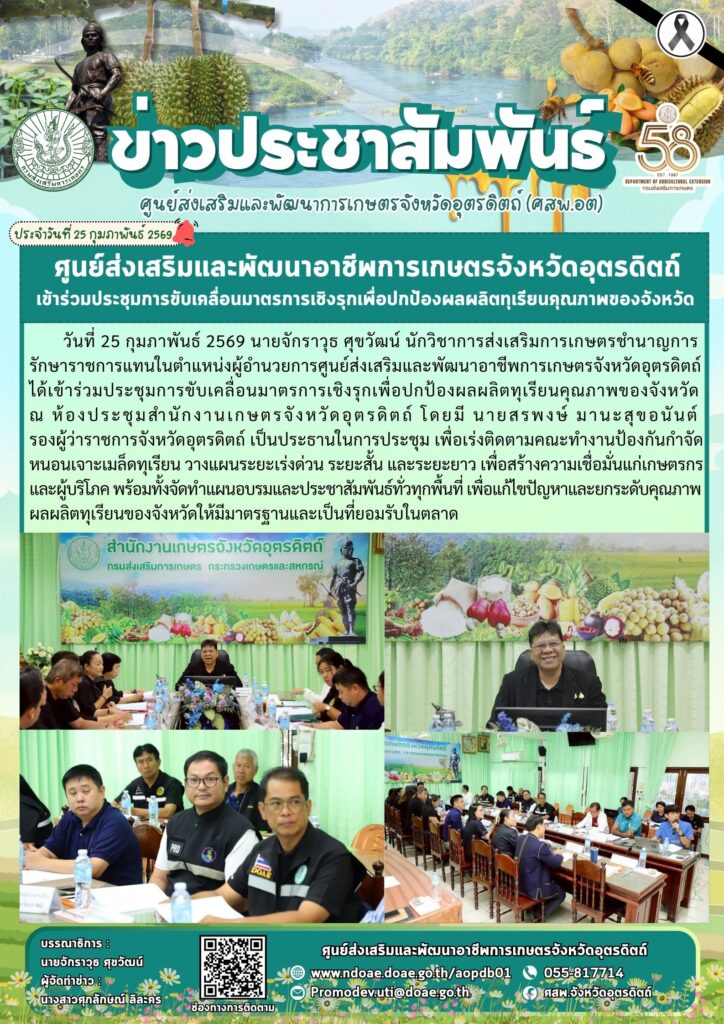 วันที่ 25 กุมภาพันธ์ 2569 นายจักราวุธ ศุขวัฒน์ นักวิชาการส่งเสริมการเกษตรชำนาญการ รักษาราชการแทนในตำแหน่งผู้อำนวยการศูนย์ส่งเสริมและพัฒนาอาชีพการเกษตรจังหวัดอุตรดิตถ์ ได้เข้าร่วมประชุมการขับเคลื่อนมาตรการเชิงรุกเพื่อปกป้องผลผลิตทุเรียนคุณภาพของจังหวัด ณ ห้องประชุมสำนักงานเกษตรจังหวัดอุตรดิตถ์ โดยมี นายสรพงษ์ มานะสุขอนันต์ รองผู้ว่าราชการจังหวัดอุตรดิตถ์ เป็นประธานในการประชุม เพื่อเร่งติดตามคณะทำงานป้องกันกำจัดหนอนเจาะเมล็ดทุเรียน วางแผนระยะเร่งด่วน ระยะสั้น และระยะยาว เพื่อสร้างความเชื่อมั่นแก่เกษตรกรและผู้บริโภค พร้อมทั้งจัดทำแผนอบรมและประชาสัมพันธ์ทั่วทุกพื้นที่ เพื่อแก้ไขปัญหาและยกระดับคุณภาพผลผลิตทุเรียนของจังหวัดให้มีมาตรฐานและเป็นที่ยอมรับในตลาดรักษาราชการแทนในตำแหน่งผู้อำนวยการศูนย์ส่งเสริมและพัฒนาอาชีพการเกษตรจังหวัดอุตรดิตถ์