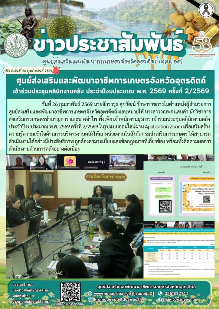 วันที่ 26 กุมภาพันธ์ 2569 นายจักราวุธ ศุขวัฒน์ รักษาราชการในตำแหน่งผู้อำนวยการศูนย์ส่งเสริมและพัฒนาอาชีพการเกษตรจังหวัดอุตรดิตถ์ มอบหมายให้ นางสาววณพร แสนคำ นักวิชาการส่งเสริมการเกษตรชำนาญการ และนางอำไพ พึ่งเพ็ง เจ้าพนักงานธุรการ เข้าร่วมประชุมคลินิกงานคลัง ประจำปีงบประมาณ พ.ศ. 2569 ครั้งที่ 2/2569 ในรูปแบบออนไลน์ผ่าน Application Zoom เพื่อเสริมสร้างความรู้ความเข้าใจด้านการบริหารงานคลังให้แก่หน่วยงานในสังกัดกรมส่งเสริมการเกษตร ให้สามารถดำเนินงานได้อย่างมีประสิทธิภาพ ถูกต้องตามระเบียบและข้อกฎหมายที่เกี่ยวข้อง พร้อมทั้งติดตามผลการดำเนินงานด้านการคลังอย่างต่อเนื่อง