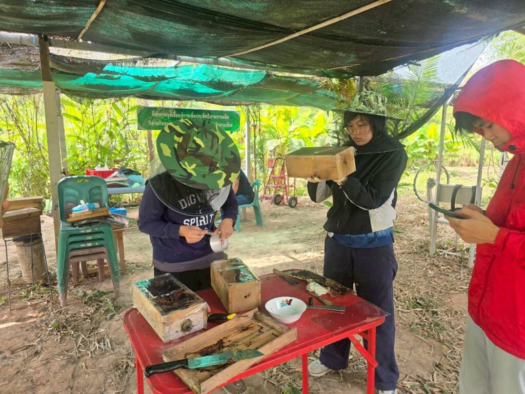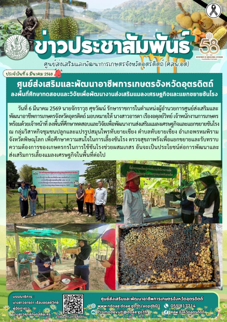 วันที่ 6 มีนาคม 2569 นายจักราวุธ ศุขวัฒน์ รักษาราชการในตำแหน่งผู้อำนวยการศูนย์ส่งเสริมและพัฒนาอาชีพการเกษตรจังหวัดอุตรดิตถ์ มอบหมายให้ นางสาวอารดา เรืองอดุลย์วิทย์ เจ้าพนักงานการเกษตร พร้อมด้วยเจ้าหน้าที่ ลงพื้นที่ศึกษาทดสอบและวิจัยเพื่อพัฒนางานส่งเสริมแมลงเศรษฐกิจและแยกขยายชันโรง ณ กลุ่มวิสาหกิจชุมชนปลูกและแปรรูปสมุนไพรทับยายเชียง ตำบลทับยายเชียง อำเภอพรหมพิราม จังหวัดพิษณุโลก เพื่อศึกษาความสนใจในการเลี้ยงชันโรง ตรวจสุขภาพรังเพื่อแยกขยายและรับทราบความต้องการของเกษตรกรในการใช้ชันโรงช่วยผสมเกสร อันจะเป็นประโยชน์ต่อการพัฒนาและส่งเสริมการเลี้ยงแมลงเศรษฐกิจในพื้นที่ต่อไป
