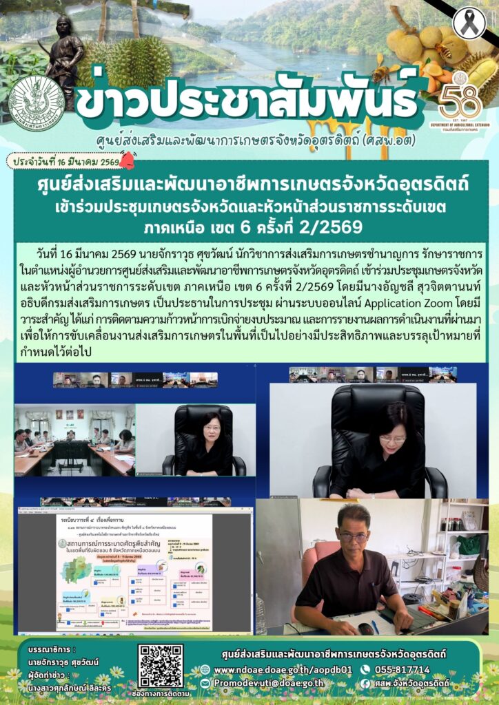 วันที่ 16 มีนาคม 2569 นายจักราวุธ ศุขวัฒน์ นักวิชาการส่งเสริมการเกษตรชำนาญการ รักษาราชการในตำแหน่งผู้อำนวยการศูนย์ส่งเสริมและพัฒนาอาชีพการเกษตรจังหวัดอุตรดิตถ์ เข้าร่วมประชุมเกษตรจังหวัดและหัวหน้าส่วนราชการระดับเขต ภาคเหนือ เขต 6 ครั้งที่ 2/2569 โดยมีนางอัญชลี สุวจิตตานนท์ อธิบดีกรมส่งเสริมการเกษตร เป็นประธานในการประชุม ผ่านระบบออนไลน์ Application Zoom โดยมีวาระสำคัญ ได้แก่ การติดตามความก้าวหน้าการเบิกจ่ายงบประมาณ และการรายงานผลการดำเนินงานที่ผ่านมา เพื่อให้การขับเคลื่อนงานส่งเสริมการเกษตรในพื้นที่เป็นไปอย่างมีประสิทธิภาพและบรรลุเป้าหมายที่กำหนดไว้ต่อไป