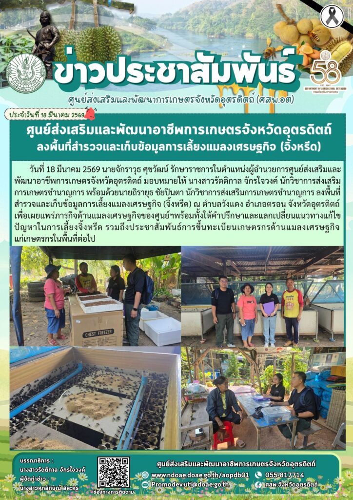 วันที่ 18 มีนาคม 2569 นายจักราวุธ ศุขวัฒน์ รักษาราชการในตำแหน่งผู้อำนวยการศูนย์ส่งเสริมและพัฒนาอาชีพการเกษตรจังหวัดอุตรดิตถ์ มอบหมายให้ นางสาวรัตติกาล จักรใจวงค์ นักวิชาการส่งเสริมการเกษตรชำนาญการ พร้อมด้วยนายถิรายุธ ชัยปินตา นักวิชาการส่งเสริมการเกษตรชำนาญการ ลงพื้นที่สำรวจและเก็บข้อมูลการเลี้ยงแมลงเศรษฐกิจ (จิ้งหรีด) ณ ตำบลวังแดง อำเภอตรอน จังหวัดอุตรดิตถ์ เพื่อเผยแพร่ภารกิจด้านแมลงเศรษฐกิจของศูนย์ฯพร้อมทั้งให้คำปรึกษาและแลกเปลี่ยนแนวทางแก้ไขปัญหาในการเลี้ยงจิ้งหรีด รวมถึงประชาสัมพันธ์การขึ้นทะเบียนเกษตรกรด้านแมลงเศรษฐกิจแก่เกษตรกรในพื้นที่ต่อไป