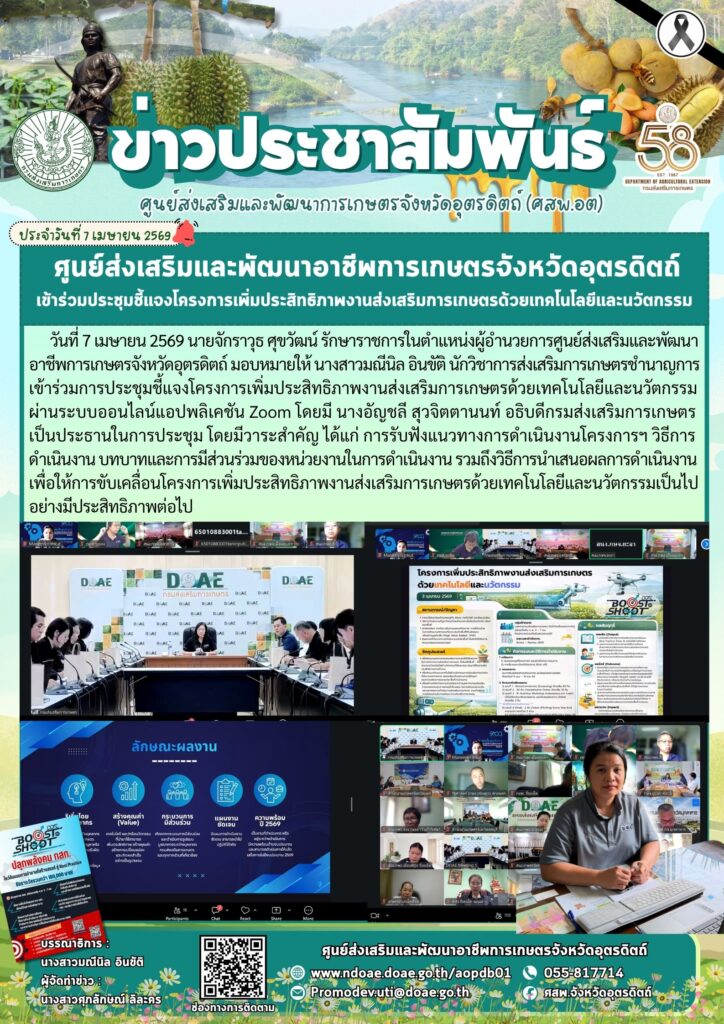 วันที่ 7 เมษายน 2569 นายจักราวุธ ศุขวัฒน์ รักษาราชการในตำแหน่งผู้อำนวยการศูนย์ส่งเสริมและพัฒนาอาชีพการเกษตรจังหวัดอุตรดิตถ์ มอบหมายให้ นางสาวมณีนิล อินขัติ นักวิชาการส่งเสริมการเกษตรชำนาญการ เข้าร่วมการประชุมชี้แจงโครงการเพิ่มประสิทธิภาพงานส่งเสริมการเกษตรด้วยเทคโนโลยีและนวัตกรรม ผ่านระบบออนไลน์แอปพลิเคชัน Zoom โดยมี นางอัญชลี สุวจิตตานนท์ อธิบดีกรมส่งเสริมการเกษตร เป็นประธานในการประชุม โดยมีวาระสำคัญ ได้แก่ การรับฟังแนวทางการดำเนินงานโครงการฯ วิธีการดำเนินงาน บทบาทและการมีส่วนร่วมของหน่วยงานในการดำเนินงาน รวมถึงวิธีการนำเสนอผลการดำเนินงานเพื่อให้การขับเคลื่อนโครงการเพิ่มประสิทธิภาพงานส่งเสริมการเกษตรด้วยเทคโนโลยีและนวัตกรรมเป็นไปอย่างมีประสิทธิภาพต่อไป