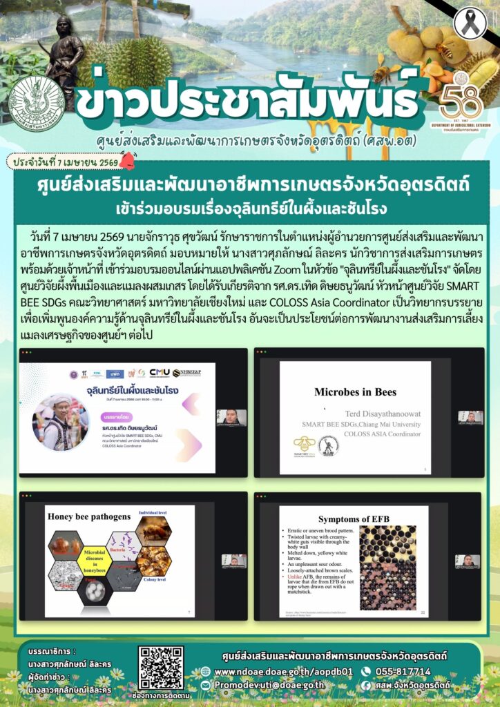 วันที่ 7 เมษายน 2569 นายจักราวุธ ศุขวัฒน์ รักษาราชการในตำแหน่งผู้อำนวยการศูนย์ส่งเสริมและพัฒนาอาชีพการเกษตรจังหวัดอุตรดิตถ์ มอบหมายให้ นางสาวศุภลักษณ์ ลิละคร นักวิชาการส่งเสริมการเกษตร พร้อมด้วยเจ้าหน้าที่ เข้าร่วมอบรมออนไลน์ผ่านแอปพลิเคชัน Zoom ในหัวข้อ “จุลินทรีย์ในผึ้งและชันโรง” จัดโดยศูนย์วิจัยผึ้งพื้นเมืองและแมลงผสมเกสร โดยได้รับเกียรติจาก รศ.ดร.เทิด ดิษยธนูวัฒน์ หัวหน้าศูนย์วิจัย SMARTBEE SDGs คณะวิทยาศาสตร์ มหาวิทยาลัยเชียงใหม่ และ COLOSS Asia Coordinator เป็นวิทยากรบรรยาย เพื่อเพิ่มพูนองค์ความรู้ด้านจุลินทรีย์ในผึ้งและชันโรง อันจะเป็นประโยชน์ต่อการพัฒนางานส่งเสริมการเลี้ยงแมลงเศรษฐกิจของศูนย์ฯ ต่อไป