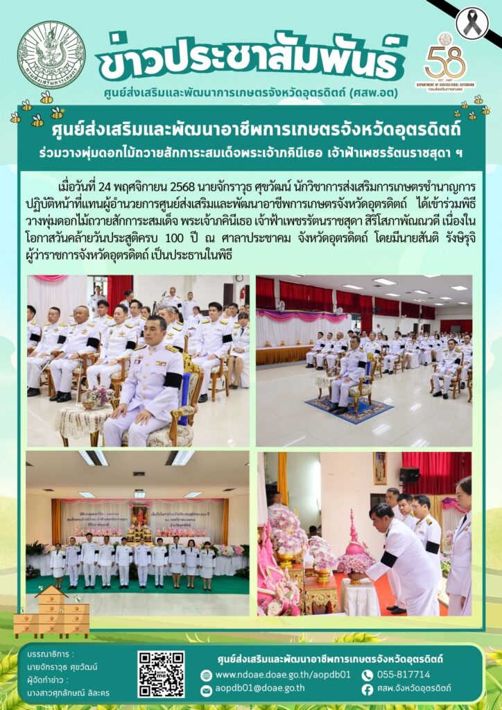 ข่าวประชาสัมพันธ์ศสพ.อุตรดิตถ์ ร่วมวางพุ่มดอกไม้ถวายสักการะสมเด็จพระเจ้าภคินีเธอ เจ้าฟ้าเพชรรัตนราชสุดา ฯ doaeUtt / 24 พฤศจิกายน 2025 เมื่อวันที่ 24 พฤศจิ