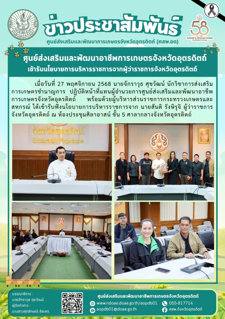 ข่าวประชาสัมพันธ์ศสพ.อุตรดิตถ์ เข้ารับนโยบายการบริหารราชการจากผู้ว่าราชการจังหวัดอุตรดิตถ์ doaeUtt / 27 พฤศจิกายน 2025 เมื่อวันที่ 27 พฤศจิ
