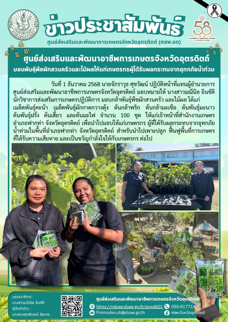 ข่าวประชาสัมพันธ์ศสพ.อุตรดิตถ์ มอบพันธุ์พืชผักสวนครัวและไม้ผลให้แก่เกษตรกรผู้ได้รับผลกระทบจากอุทกภัยน้ำท่วม doaeUtt / 1 ธันวาคม 2025 เมื่อวันที่ 1 ธันวาค