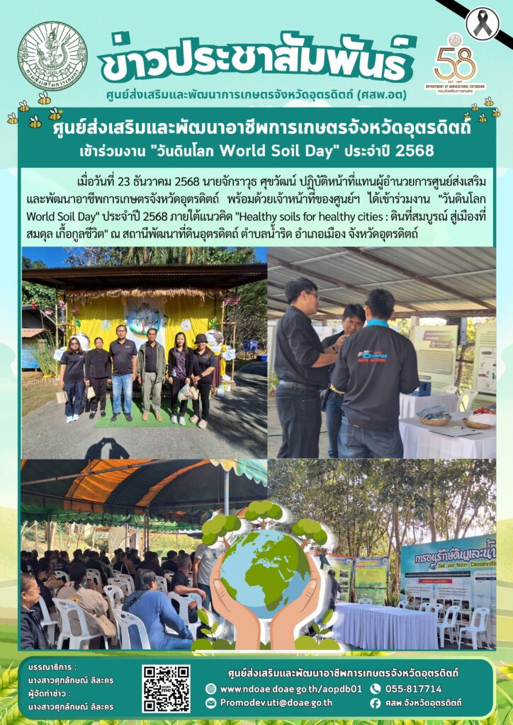 ข่าวประชาสัมพันธ์ศสพ.อุตรดิตถ์ เข้าร่วมงาน “วันดินโลก World Soil Day” ประจำปี 2568 doaeUtt / 23 ธันวาคม 2025 เมื่อวันที่ 23 ธันวา