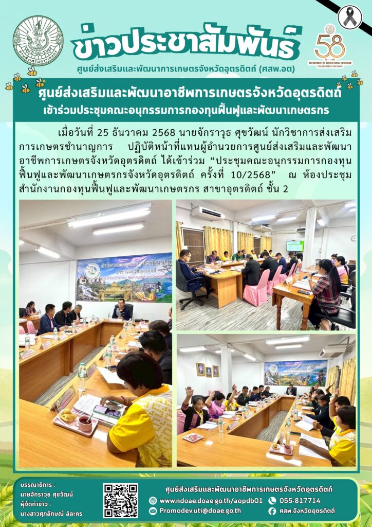 ข่าวประชาสัมพันธ์ศสพ.อุตรดิตถ์ เข้าร่วมประชุมคณะอนุกรรมการกองทุนฟื้นฟูและพัฒนาเกษตรกร doaeUtt / 25 ธันวาคม 2025 เมื่อวันที่ 25 ธันวา