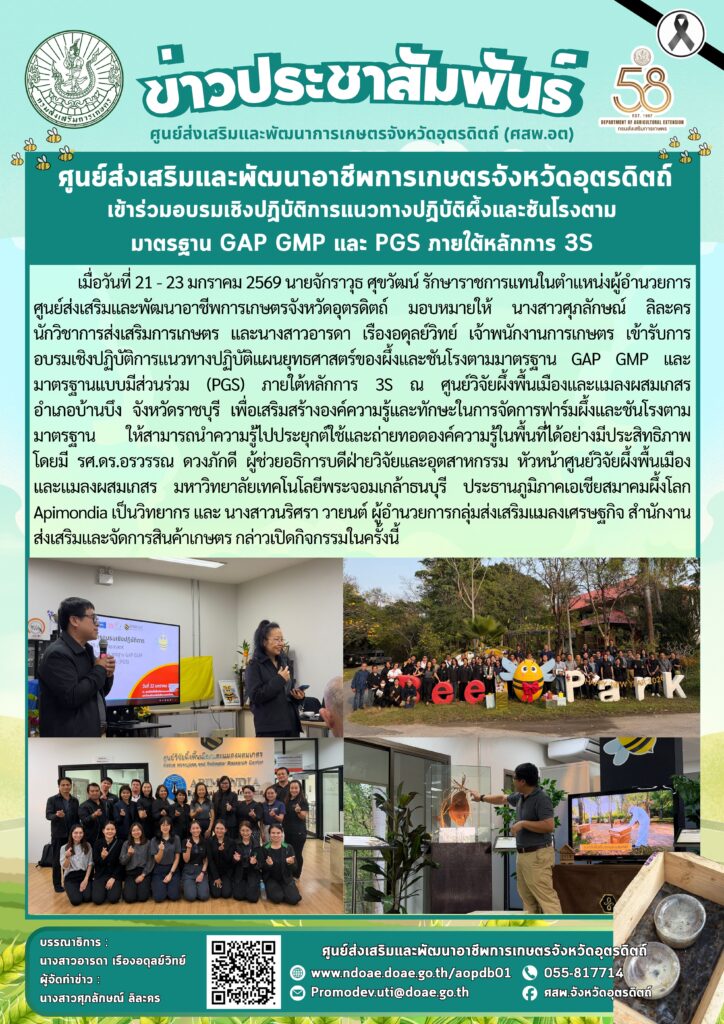 ข่าวประชาสัมพันธ์ศสพ.อุตรดิตถ์ เข้าร่วมอบรมเชิงปฏิบัติการแนวทางปฏิบัติผึ้งและชันโรงตามมาตรฐาน GAP GMP และ PGS ภายใต้หลักการ 3S doaeUtt / 23 มกราคม 2026 เมื่อวันที่ 21-23 มก