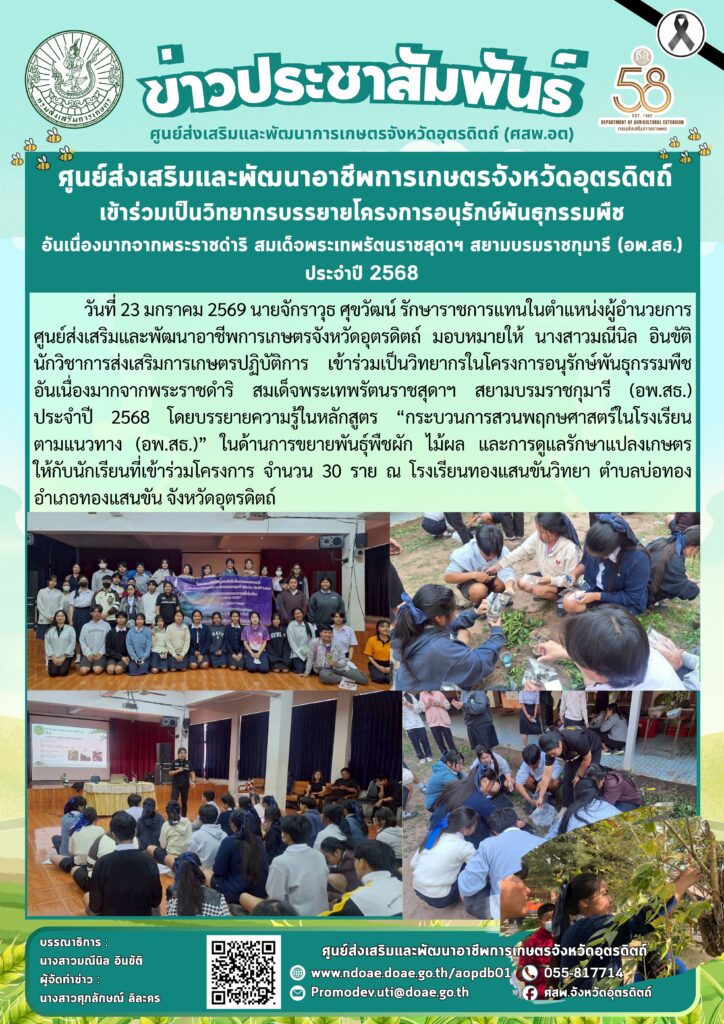 ข่าวประชาสัมพันธ์ศสพ.อุตรดิตถ์ เข้าร่วมเป็นวิทยากรบรรยายโครงการอนุรักษ์พันธุกรรมพืช อันเนื่องมากจากพระราชดําริ สมเด็จพระเทพรัตนราชสุดาฯ สยามบรมราชกุมารี (อพ.สธ.) ประจําปี 2568 doaeUtt / 23 มกราคม 2026 วันที่ 23 มกราคม 256