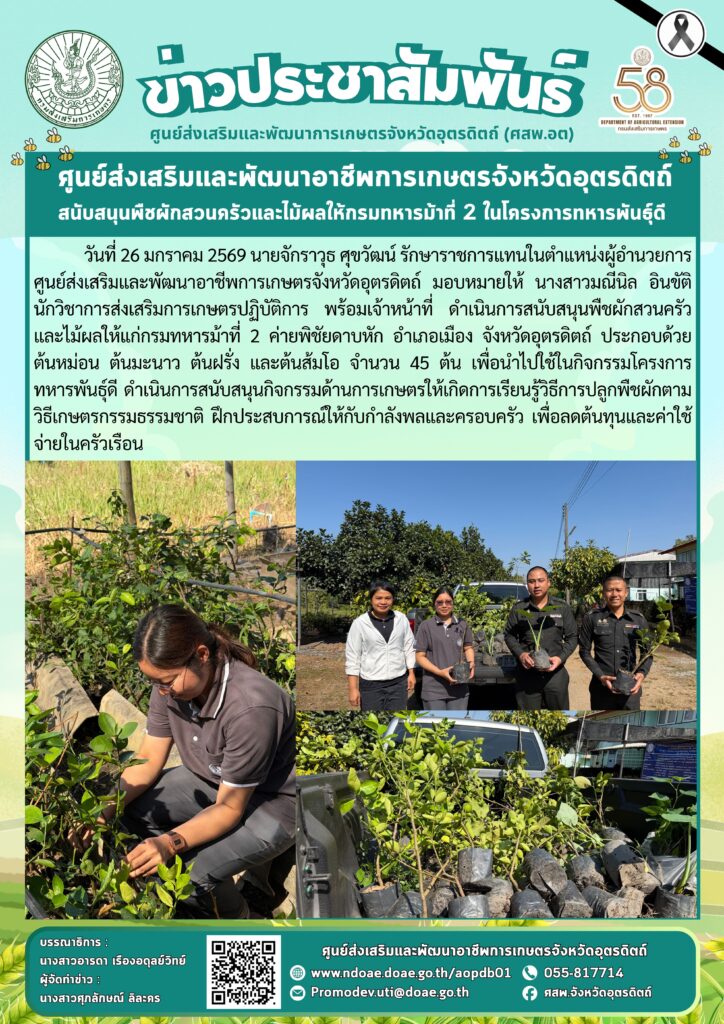 ข่าวประชาสัมพันธ์ศสพ.อุตรดิตถ์ สนับสนุนพืชผักสวนครัวและไม้ผลให้กรมทหารม้าที่ 2 ในโครงการทหารพันธุ์ดี doaeUtt / 26 มกราคม 2026 วันที่ 26 มกราคม 256