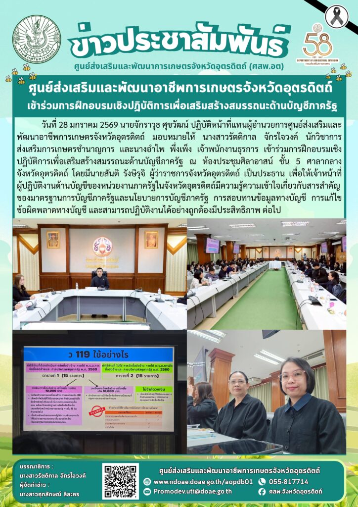 ข่าวประชาสัมพันธ์ศสพ.อุตรดิตถ์ เข้าร่วมการฝึกอบรมเชิงปฏิบัติการเพื่อเสริมสร้างสมรรถนะด้านบัญชีภาครัฐ doaeUtt / 28 มกราคม 2026 วันที่ 28 มกราคม 256