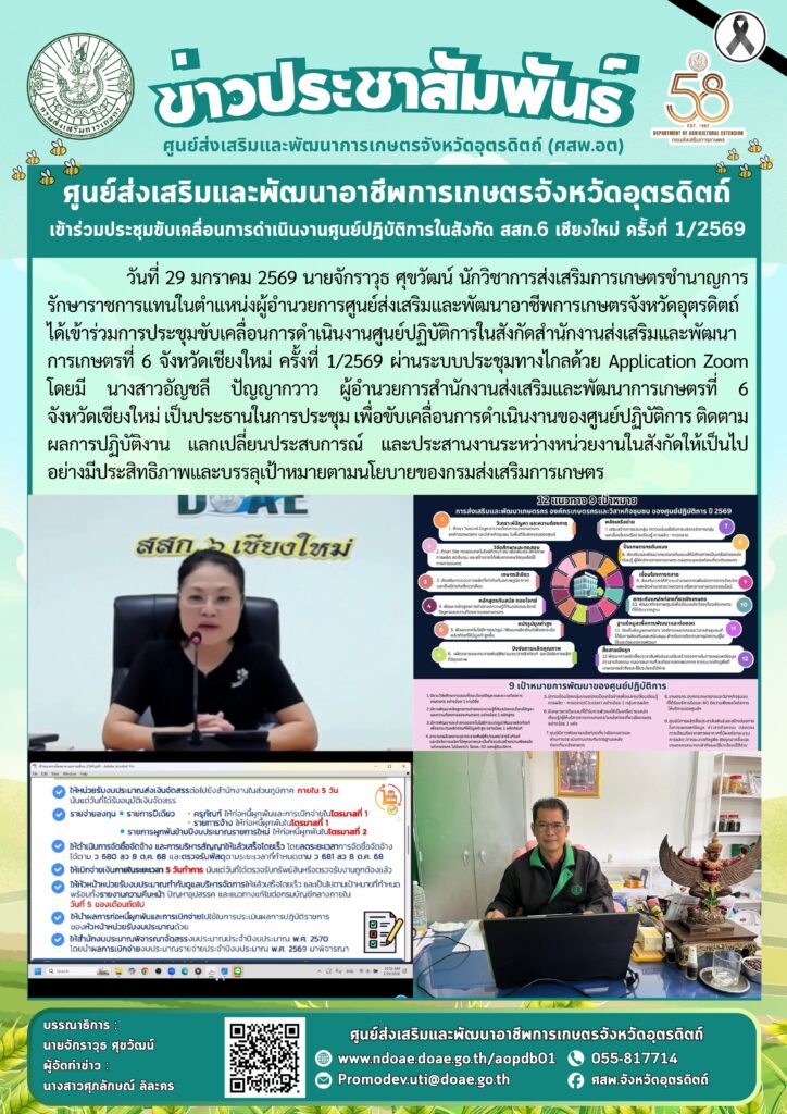 ข่าวประชาสัมพันธ์ศสพ.อุตรดิตถ์ เข้าร่วมประชุมขับเคลื่อนการดำเนินงานศูนย์ปฏิบัติการในสังกัด สสก.6 เชียงใหม่ ครั้งที่ 1/2569 doaeUtt / 29 มกราคม 2026 วันที่ 29 มกราคม 256