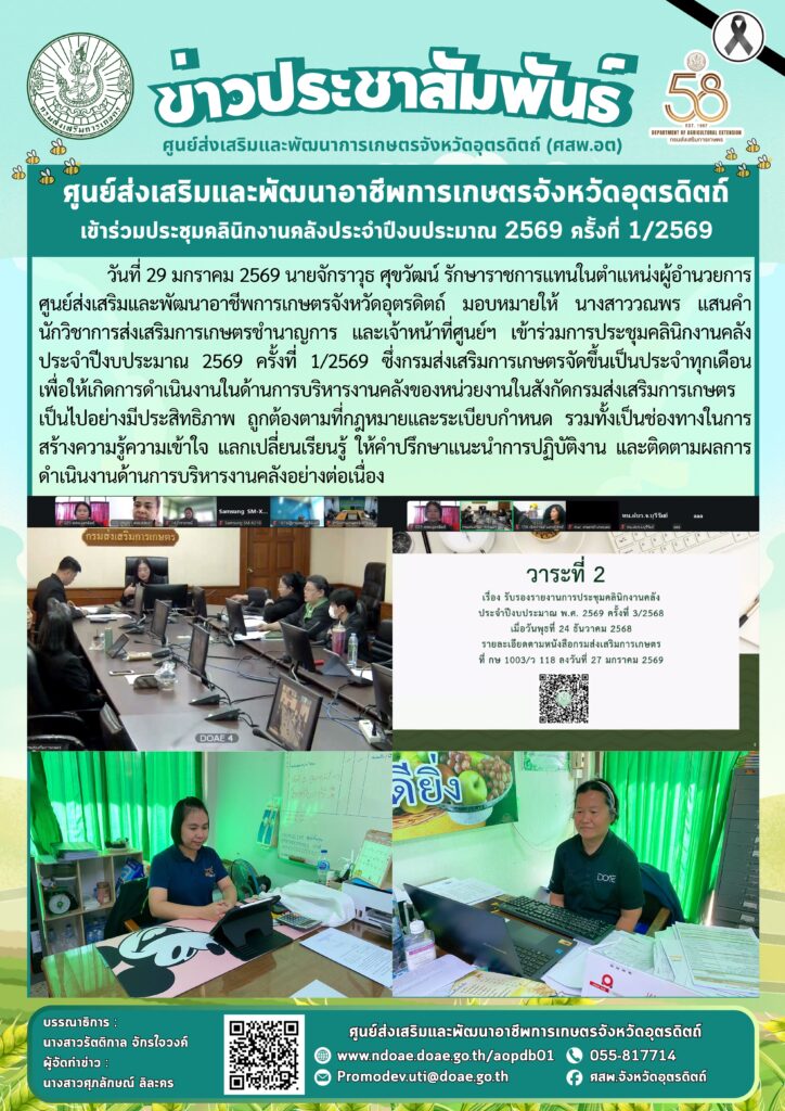 ข่าวประชาสัมพันธ์ศสพ.อุตรดิตถ์ เข้าร่วมประชุมคลินิกงานคลังประจำปีงบประมาณ 2569 ครั้งที่ 1/2569 doaeUtt / 29 มกราคม 2026 วันที่ 29 มกราคม 256