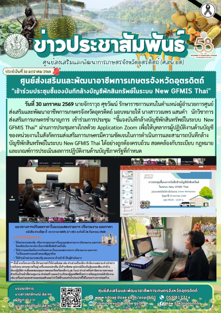 ข่าวประชาสัมพันธ์ศสพ.อุตรดิตถ์ เข้าร่วมประชุมชี้แจงบันทึกล้างบัญชีพักสินทรัพย์ในระบบ New GFMIS Thai doaeUtt / 30 มกราคม 2026 วันที่ 30 มกราคม 256 […]