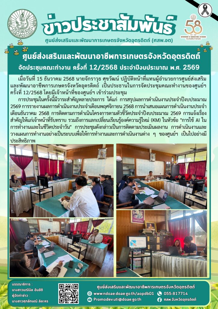 ข่าวประชาสัมพันธ์ศสพ.อุตรดิตถ์ จัดประชุมคณะทำงาน ครั้งที่ 12/2568 ประจำปีงบประมาณ พ.ศ. 2569 doaeUtt / 15 ธันวาคม 2025 เมื่อวันที่ 15 ธันวา