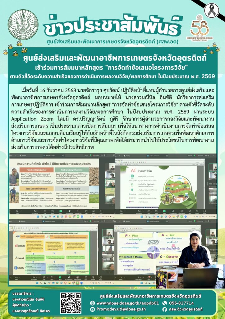 ข่าวประชาสัมพันธ์ศสพ.อุตรดิตถ์ เข้าร่วมการสัมมนาหลักสูตร “การจัดทำข้อเสนอโครงการวิจัย” ตามตัวชี้วัดระดับความสำเร็จของการดำเนินการผลงานวิจัย/ผลการศึกษา ในปีงบประมาณ พ.ศ. 2569 doaeUtt / 16 ธันวาคม 2025 เมื่อวันที่ 16 ธันวา