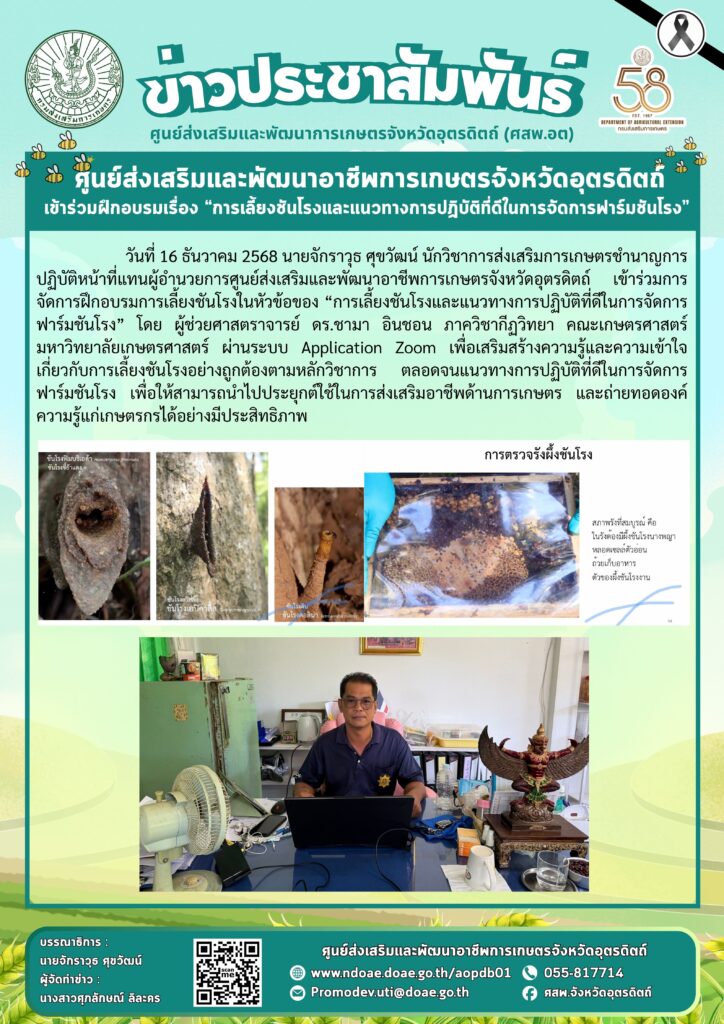 ข่าวประชาสัมพันธ์ศสพ.อุตรดิตถ์ เข้าร่วมฝึกอบรมเรื่อง “การเลี้ยงชันโรงและแนวทางการปฏิบัติที่ดีในการจัดการฟาร์มชันโรง” doaeUtt / 16 ธันวาคม 2025 วันที่ 16 ธันวาคม 25