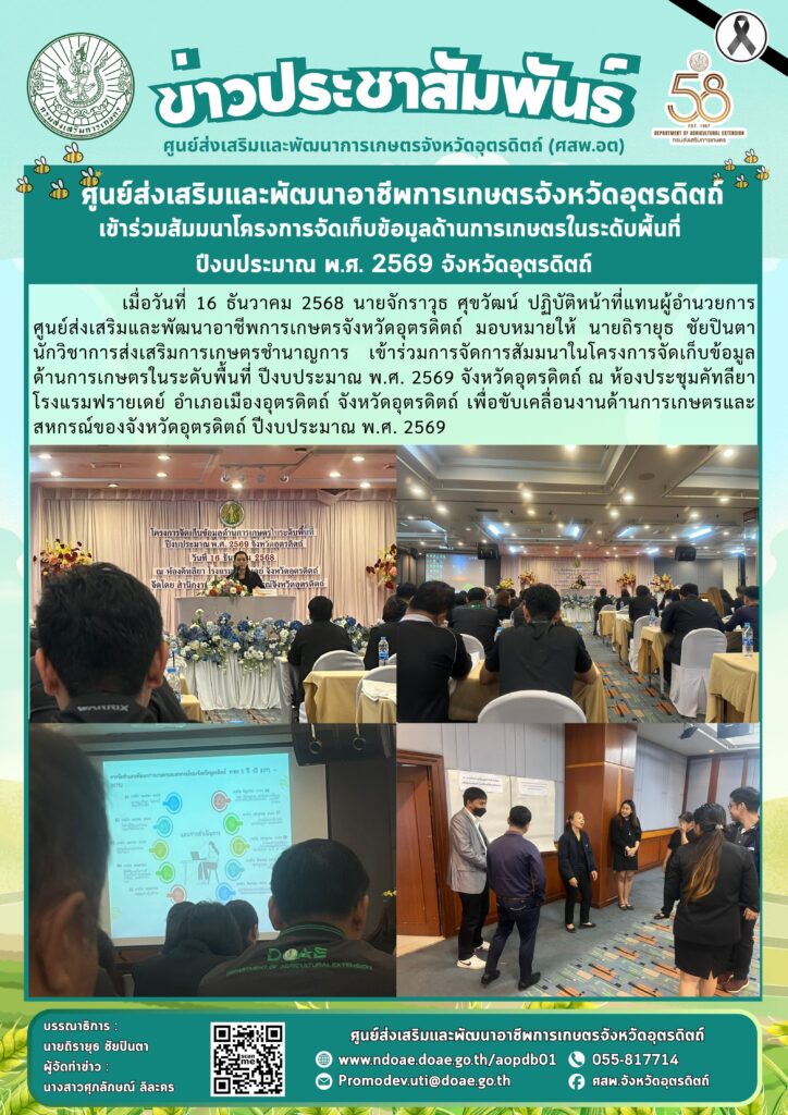ข่าวประชาสัมพันธ์ศสพ.อุตรดิตถ์ เข้าร่วมสัมมนาโครงการจัดเก็บข้อมูลด้านการเกษตรในระดับพื้นที่ ปีงบประมาณ พ.ศ. 2569 จังหวัดอุตรดิตถ์ doaeUtt / 16 ธันวาคม 2025 เมื่อวันที่ 16 ธันวา