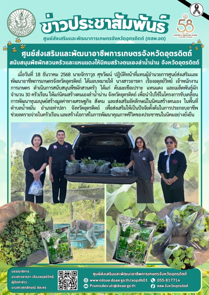 ข่าวประชาสัมพันธ์ศสพ.อุตรดิตถ์ สนับสนุนพืชผักสวนครัวให้โครงการ “ปลูกผักสวนครัวในรั้วบ้าน ปลอดสารพิษ” doaeUtt / 11 ธันวาคม 2025 เมื่อวันที่ 11 ธันวา