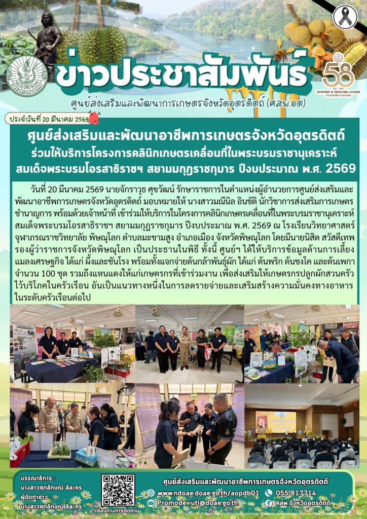 ข่าวประชาสัมพันธ์ศสพ.อุตรดิตถ์ ร่วมให้บริการโครงการคลินิกเกษตรเคลื่อนที่ในพระบรมราชานุเคราะห์ สมเด็จพระบรมโอรสาธิราชฯ สยามมกุฎราชกุมาร ปีงบประมาณ พ.ศ. 2569 doaeUtt / 20 มีนาคม 2026 วันที่ 20 มีนาคม 256