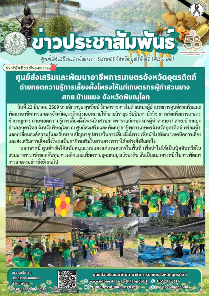 ข่าวประชาสัมพันธ์ศสพ.อุตรดิตถ์ ถ่ายทอดความรู้การเลี้ยงผึ้งโพรงและสนับสนุนแหนแดงแก่เกษตรกรผู้ทำสวนยาง สกย.บ้านแยง จังหวัดพิษณุโลก doaeUtt / 23 มีนาคม 2026 วันที่ 23 มีนาคม 256
