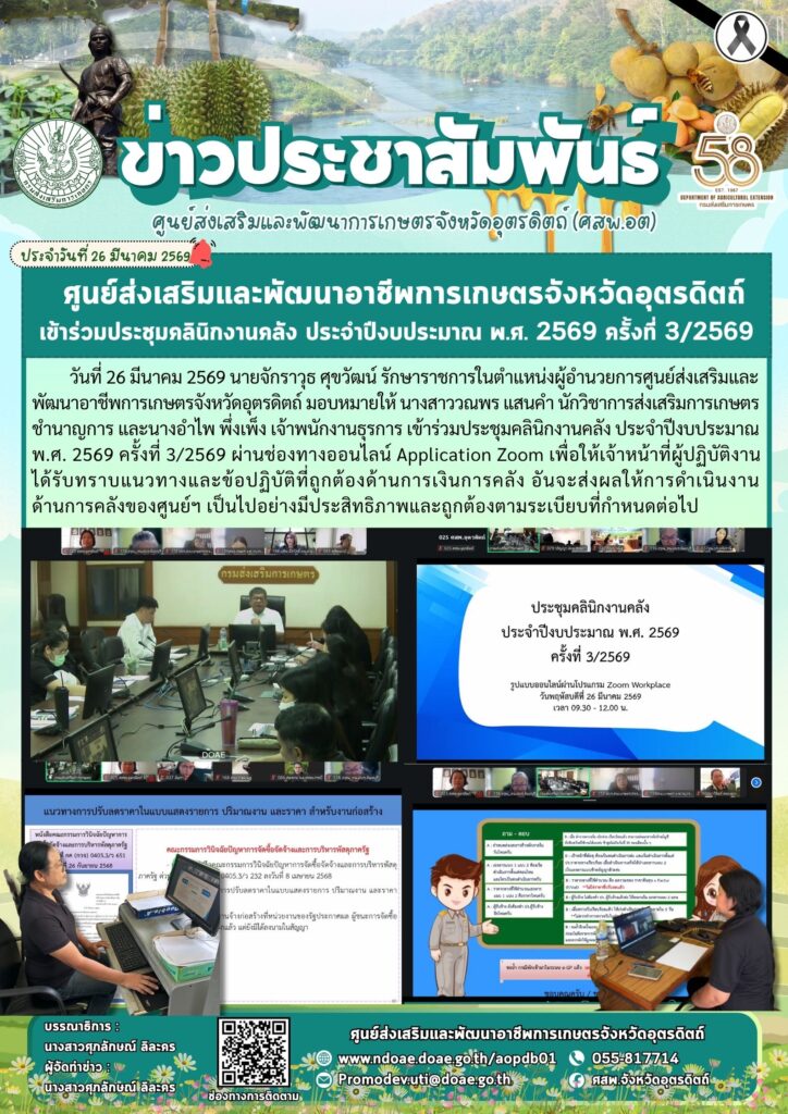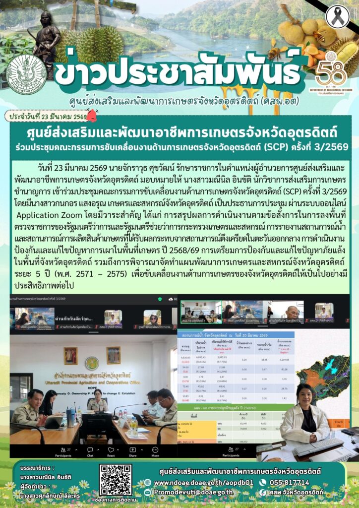 ข่าวประชาสัมพันธ์ศสพ.อุตรดิตถ์ ร่วมประชุมคณะกรรมการขับเคลื่อนงานด้านการเกษตรจังหวัดอุตรดิตถ์ (SCP) ครั้งที่ 3/2569 doaeUtt / 23 มีนาคม 2026 วันที่ 23 มีนาคม 256