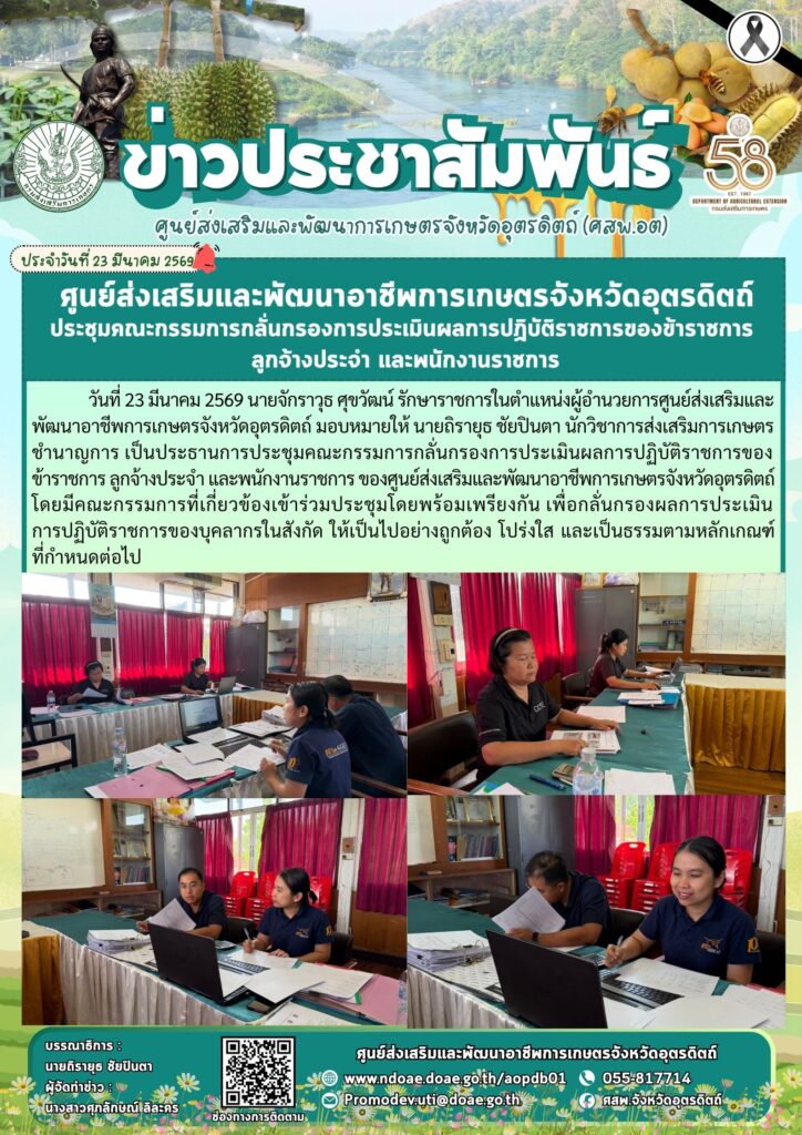 ข่าวประชาสัมพันธ์ศสพ.อุตรดิตถ์ ประชุมคณะกรรมการกลั่นกรองการประเมินผลการปฏิบัติราชการของข้าราชการ ลูกจ้างประจำ และพนักงานราชการ doaeUtt / 23 มีนาคม 2026 วันที่ 23 มีนาคม 256