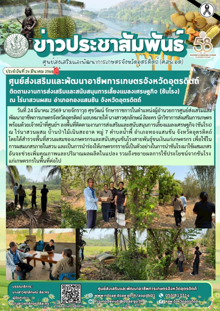 ข่าวประชาสัมพันธ์ศสพ.อุตรดิตถ์ ติดตามงานการส่งเสริมและสนับสนุนการเลี้ยงแมลงเศรษฐกิจ (ชันโรง) ณ ไร่นาสวนผสม อำเภอทองแสนขัน จังหวัดอุตรดิตถ์ doaeUtt / 24 มีนาคม 2026 วันที่ 24 มีนาคม 256