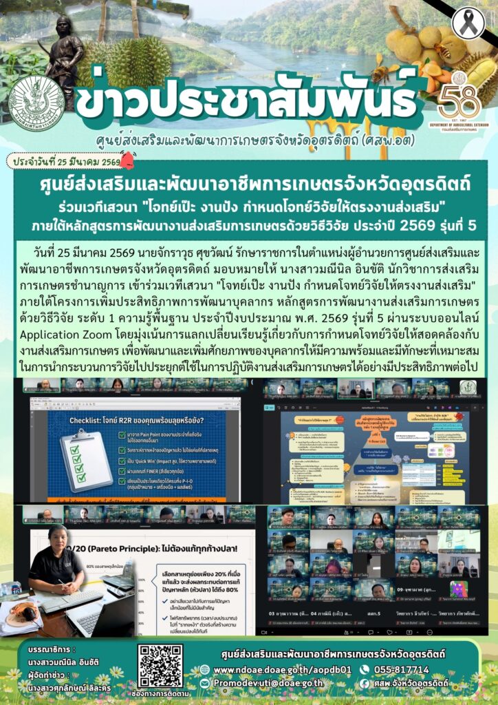 ข่าวประชาสัมพันธ์ศสพ.อุตรดิตถ์ ร่วมเวทีเสวนา “โจทย์เป๊ะ งานปัง กำหนดโจทย์วิจัยให้ตรงงานส่งเสริม” ภายใต้หลักสูตรการพัฒนางานส่งเสริมการเกษตรด้วยวิธีวิจัย ประจำปี 2569 รุ่นที่ 5 doaeUtt / 25 มีนาคม 2026 วันที่ 25 มีนาคม 256