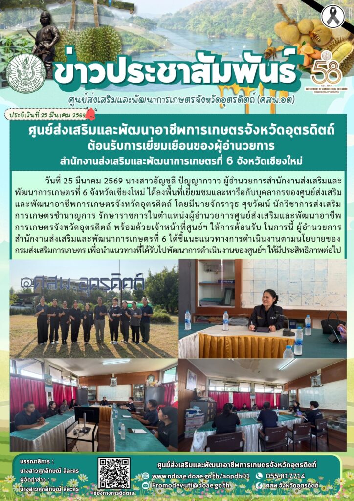 ข่าวประชาสัมพันธ์ศสพ.อุตรดิตถ์ ต้อนรับการเยี่ยมเยือนของผู้อำนวยการสำนักงานส่งเสริมและพัฒนาการเกษตรที่ 6 จังหวัดเชียงใหม่ doaeUtt / 25 มีนาคม 2026 วันที่ 25 มีนาคม 256