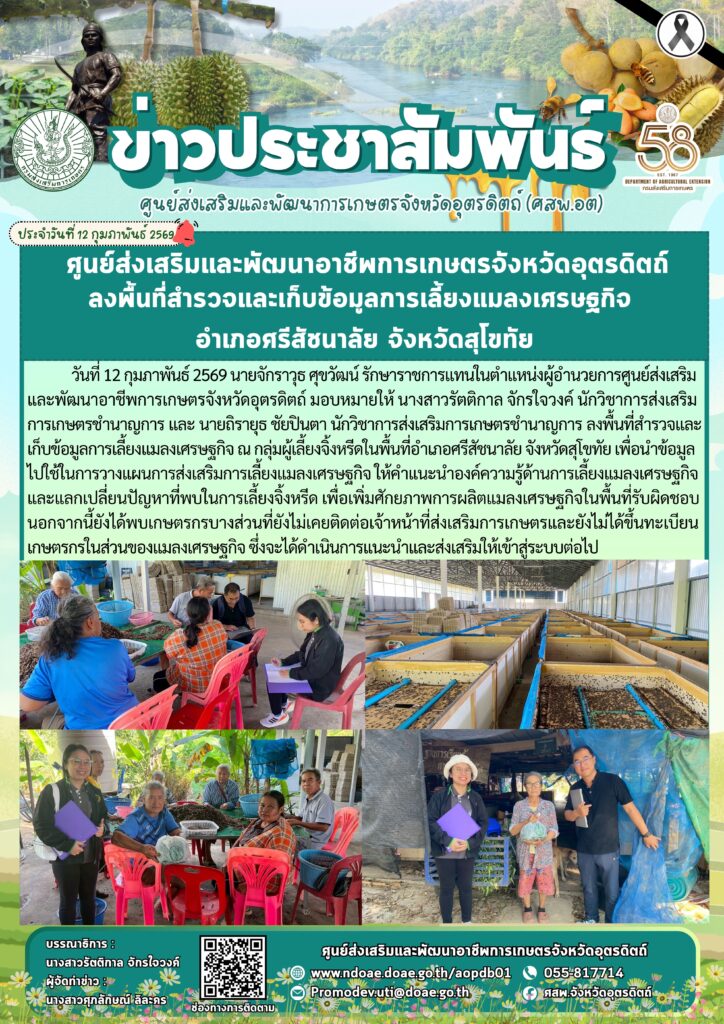 ข่าวประชาสัมพันธ์ศสพ.อุตรดิตถ์ ลงพื้นที่สำรวจและเก็บข้อมูลการเลี้ยงแมลงเศรษฐกิจ อำเภอศรีสัชนาลัย จังหวัดสุโขทัย doaeUtt / 12 กุมภาพันธ์ 2026 วันที่ 12 กุมภาพันธ์