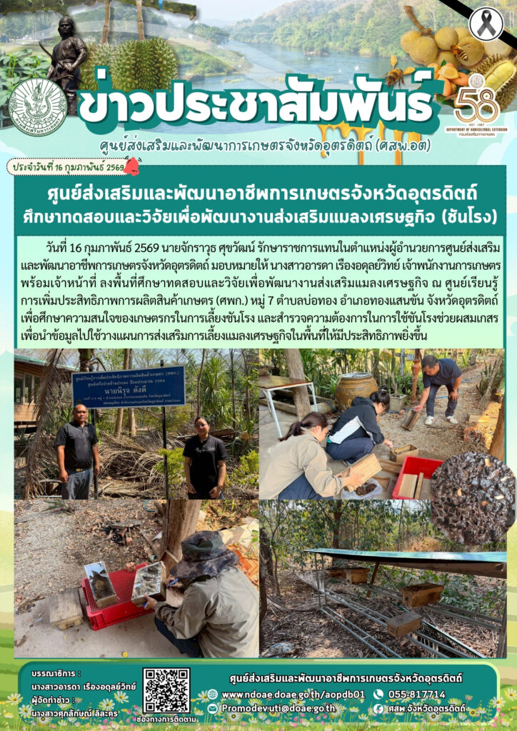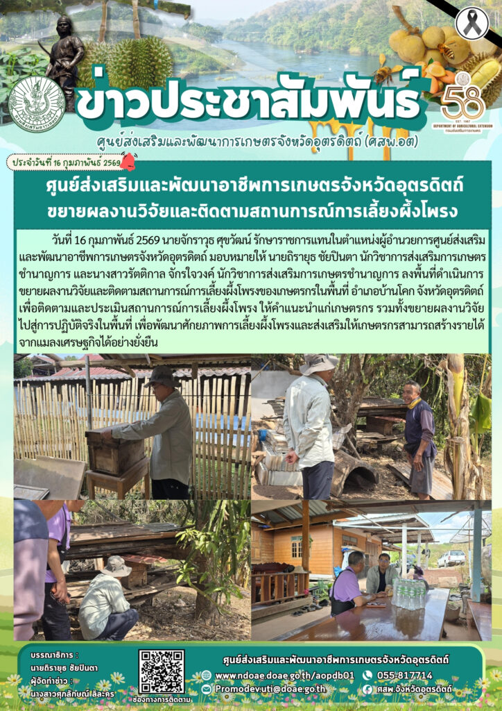 ข่าวประชาสัมพันธ์ศสพ.อุตรดิตถ์ ขยายผลงานวิจัยและติดตามสถานการณ์การเลี้ยงผึ้งโพรง doaeUtt / 16 กุมภาพันธ์ 2026 วันที่ 16 กุมภาพันธ์