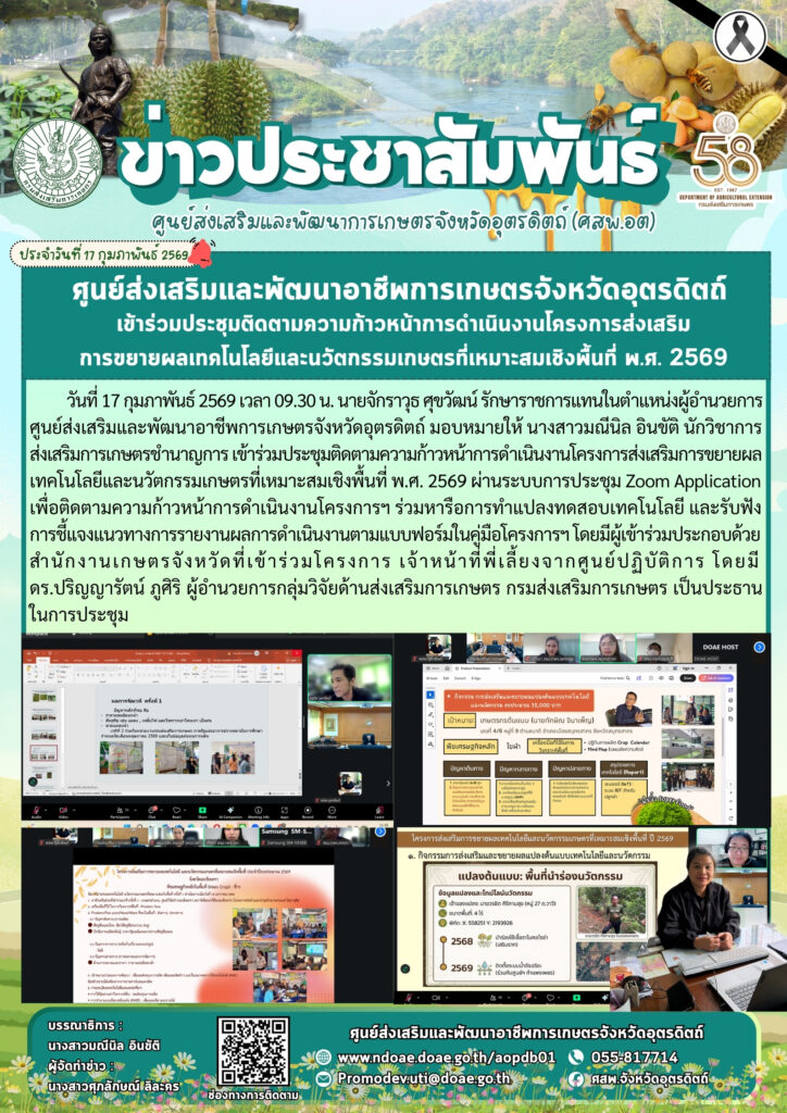 ข่าวประชาสัมพันธ์ศสพ.อุตรดิตถ์ เข้าร่วมประชุมติดตามความก้าวหน้าการดำเนินงานโครงการส่งเสริมการขยายผลเทคโนโลยีและนวัตกรรมเกษตรที่เหมาะสมเชิงพื้นที่ พ.ศ. 2569 doaeUtt / 17 กุมภาพันธ์ 2026 วันที่ 17 กุมภาพันธ์