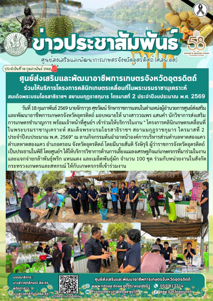 ข่าวประชาสัมพันธ์ศสพ.อุตรดิตถ์ ร่วมให้บริการโครงการคลินิกเกษตรเคลื่อนที่ในพระบรมราชานุเคราะห์ สมเด็จพระบรมโอรสาธิราชฯ สยามมกุฎราชกุมาร ไตรมาสที่ 2 ประจำปีงบประมาณ พ.ศ. 2569 doaeUtt / 18 กุมภาพันธ์ 2026 วันที่ 18 กุมภาพันธ์
