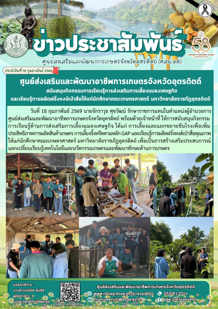 ข่าวประชาสัมพันธ์ศสพ.อุตรดิตถ์ สนับสนุนกิจกรรมการเรียนรู้การส่งเสริมการเลี้ยงแมลงเศษฐกิจและเรียนรู้การผลิตฝรั่งหงษ์เป่าสือให้แก่นักศึกษาคณะเกษตรศาสตร์ มหาวิทยาลัยราชภัฏอุตรดิตถ์ doaeUtt / 18 กุมภาพันธ์ 2026 วันที่ 18 กุมภาพันธ์