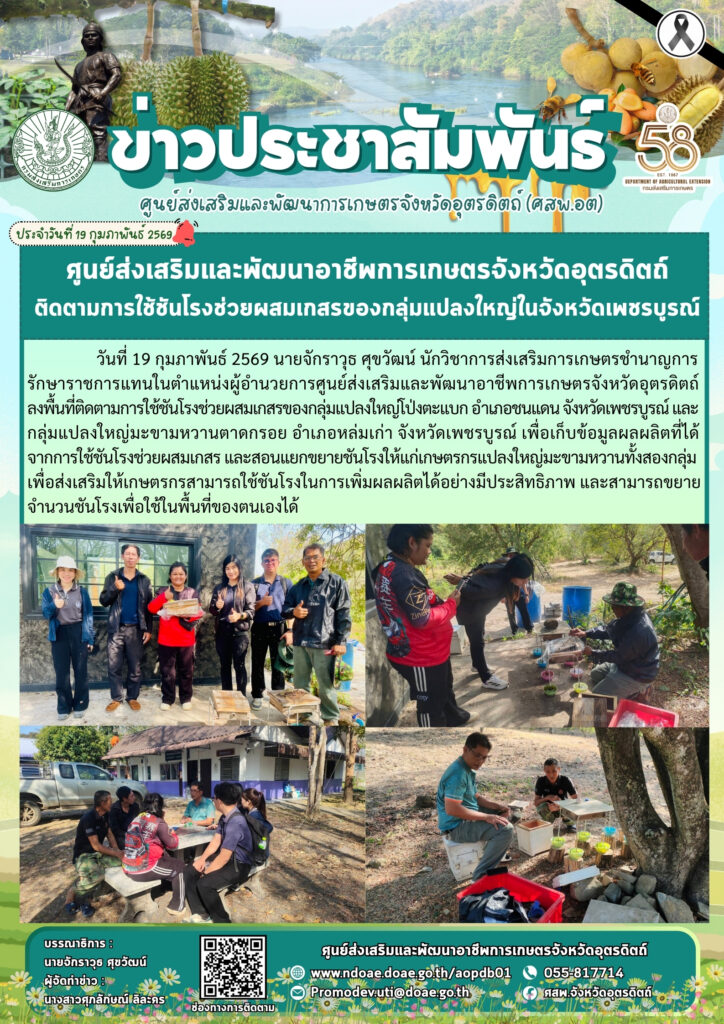 ข่าวประชาสัมพันธ์ศสพ.อุตรดิตถ์ ติดตามการใช้ชันโรงช่วยผสมเกสรของกลุ่มแปลงใหญ่ในจังหวัดเพชรบูรณ์ doaeUtt / 19 กุมภาพันธ์ 2026 วันที่ 19 กุมภาพันธ์
