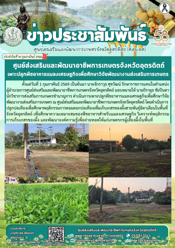 ข่าวประชาสัมพันธ์ศสพ.อุตรดิตถ์ เพาะปลูกพืชอาหารแมลงเศรษฐกิจเพื่อศึกษาวิจัยพัฒนางานส่งเสริมการเกษตร doaeUtt / 19 กุมภาพันธ์ 2026 ตั้งแต่วันที่ 1 กุมภ