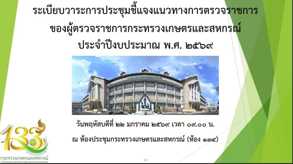 วันที่ 22 มกราคม 2569 เวลา 9.00 น. นายอนุรักษ์ เรือนหล้า ผู้อำนวยการศูนย์ส่งเสริมและพัฒนาอาชีพการเกษตร จังหวัดกำแพงเพชร มอบหมายให้ นางโชติรส ไกรวุฒินันท์ นักวิชาการส่งเสริมการเกษตรชำนาญการ ร่วมประชุมชี้แจงแนวทางการตรวจราชการตามแผนการตรวจราชการของผู้ตรวจราชการกระทรวงเกษตรและสหกรณ์ ประจำปีงบประมาณ พ.ศ. 2569 (ผ่านระบบออนไลน์ Zoom Meeting ) ณ ห้องประชุมกระทรวงเกษตรและสหกรณ์จังหวัดกำแพงเพชร ศาลากลางจังหวัดกำแพงเพชร ชั้น 3