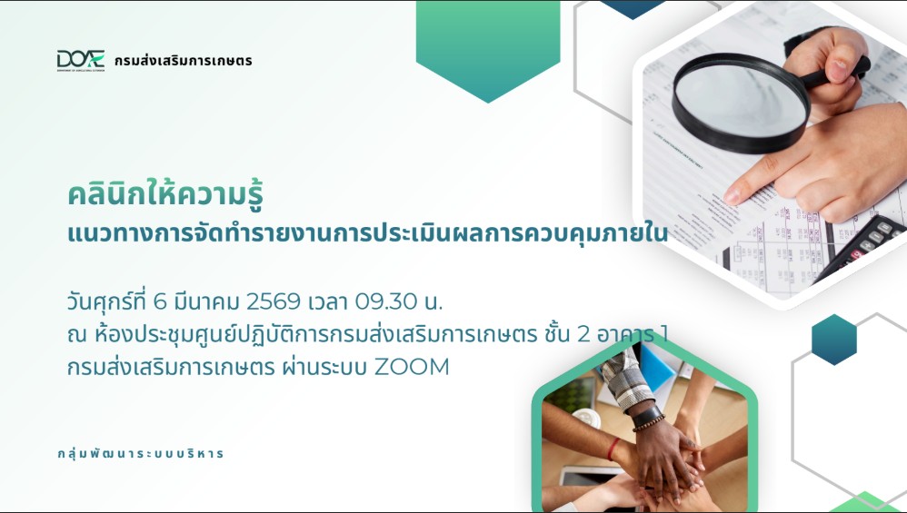 วันที่ 6 มีนาคม 2569 เวลา 9.30 น. นายอนุรักษ์ เรือนหล้า ผู้อำนวยการศูนย์ส่งเสริมและพัฒนาอาชีพการเกษตร จังหวัดกำแพงเพชร มอบหมายให้ ฝ่ายบริหาร และเจ้าหน้าที่ศูนย์ส่งเสริมและพัฒนาอาชีพการเกษตร จังหวัดกำแพงเพชรร่วมประชุมคลินิกให้ความรู้แนวทางการจัดทำรายงานการประเมินผลการควบคุมภายใน โดยประชุมทางไกลผ่านระบบ Zoom Meeting