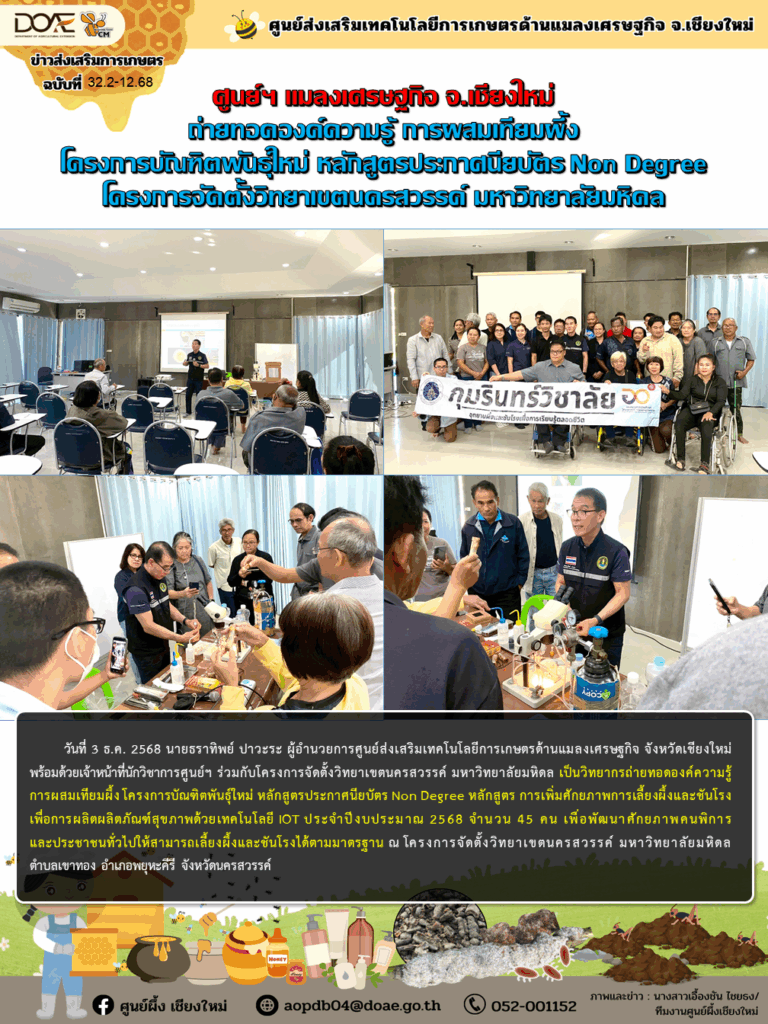 วันที่ 3 ธ.ค. 2568 นายธราทิพย์ ปาวะระ ผู้อำนวยการศูนย์ส่งเสริมเทคโนโลยีการเกษตรด้านแมลงเศรษฐกิจ จังหวัดเชียงใหม่ พร้อมด้วยเจ้าหน้าที่นักวิชาการศูนย์ฯ ร่วมกับโครงการจัดตั้งวิทยาเขตนครสวรรค์ มหาวิทยาลัยมหิดล เป็นวิทยากรถ่ายทอดองค์ความรู้ การผสมเทียมผึ้ง โครงการบัณฑิตพันธุ์ใหม่ หลักสูตรประกาศนียบัตร Non Degree หลักสูตร การเพิ่มศักยภาพการเลี้ยงผึ้งและชันโรง เพื่อการผลิตผลิตภัณฑ์สุขภาพด้วยเทคโนโลยี IOT ประจำปีงบประมาณ 2568 จำนวน 45 คน เพื่อพัฒนาศักยภาพคนพิการและประชาชนทั่วไปให้สามารถเลี้ยงผึ้งและชันโรงได้ตามมาตรฐาน ณ โครงการจัดตั้งวิทยาเขตนครสวรรค์ มหาวิทยาลัยมหิดล ตำบลเขาทอง อำเภอพยุหะคีรี จังหวัดนครสวรรค์