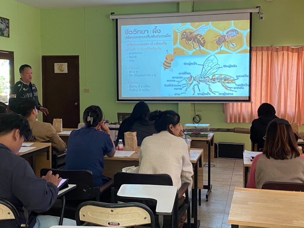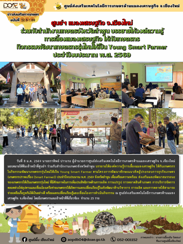 วันที่ 8 ม.ค. 2569 นายธราทิพย์ ปาวะระ ผู้อำนวยการศูนย์ส่งเสริมเทคโนโลยีการเกษตรด้านแมลงเศรษฐกิจ จ.เชียงใหม่ มอบหมายให้ทีมเจ้าหน้าที่ศูนย์ฯ ร่วมกับสำนักงานเกษตรจังหวัดลำพูน บรรยายให้องค์ความรู้การเลี้ยงแมลงเศรษฐกิจ ให้กับเกษตรกร ในกิจกรรมพัฒนาเกษตรกรรุ่นใหม่ให้เป็น Young Smart Farmer ตามโครงการพัฒนาทักษะแนวคิดผู้ประกอบการธุรกิจเกษตร (เกษตรกรปราดเปรื่อง (Smart Farmer)) ประจำปีงบประมาณ พ.ศ. 2569 จังหวัดลำพูน เพื่อเตรียมความพร้อม ส่งเสริมและพัฒนาสมรรถนะของเกษตรกรให้เป็นเกษตรกรรุ่นใหม่ ที่มีศักยภาพในการเพิ่มประสิทธิภาพด้านการผลิต การแปรรูป การตลาดสินค้าเกษตร การบริการจัดการตลอดห่วงโซ่อุปทานและเชื่อมโยงเครือข่ายเกษตรกรให้เกิดการแลกเปลี่ยนเรียนรู้ในเชิงพัฒนาด้านวิชาการ การผลิต และการตลาดให้สามารถช่วยเหลือเกื้อกูลกันได้เป็นอย่างดี พร้อมแลกเปลี่ยนเรียนรู้และเชื่อมโยงการดำเนินกิจกรรม ณ ศูนย์ส่งเสริมเทคโนโลยีการเกษตรด้านแมลงเศรษฐกิจ จ.เชียงใหม่ โดยมีเกษตรกรและเจ้าหน้าที่ที่เกี่ยวข้อง จำนวน 25 ราย