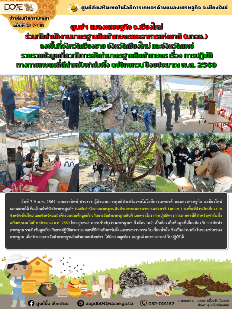 วันที่ 7-9 ม.ค. 2569 นายธราทิพย์ ปาวะระ ผู้อำนวยการศูนย์ส่งเสริมเทคโนโลยีการเกษตรด้านแมลงเศรษฐกิจ จ.เชียงใหม่ มอบหมายให้ ทีมเจ้าหน้าที่นักวิชาการศูนย์ฯ ร่วมกับสำนักงานมาตรฐานสินค้าเกษตรและอาหารแห่งชาติ (มกอช.) ลงพื้นที่จังหวัดเชียงราย จังหวัดเชียงใหม่ และจังหวัดแพร่ เพื่อรวบรวมข้อมูลเกี่ยวกับการจัดทำมาตรฐานสินค้าเกษตร เรื่อง การปฏิบัติทางการเกษตรที่ดีสำหรับฟาร์มผึ้ง ฉบับทบทวน ในปีงบประมาณ พ.ศ. 2569 โดยอยู่ระหว่างการปรับปรุงร่างมาตรฐานฯ จึงมีความจำเป็นต้องเก็บข้อมูลที่เกี่ยวข้องกับการจัดทำมาตรฐาน รวมถึงข้อมูลเกี่ยวกับการปฏิบัติทางการเกษตรที่ดีสำหรับฟาร์มผึ้งและกระบวนการเก็บเกี่ยวน้ำผึ้ง ซึ่งเป็นส่วนหนึ่งในขอบข่ายของมาตรฐาน เพื่อประกอบการจัดทำมาตรฐานสินค้าเกษตรดังกล่าว ให้มีความถูกต้อง สมบูรณ์ และสามารถนำไปปฏิบัติได้